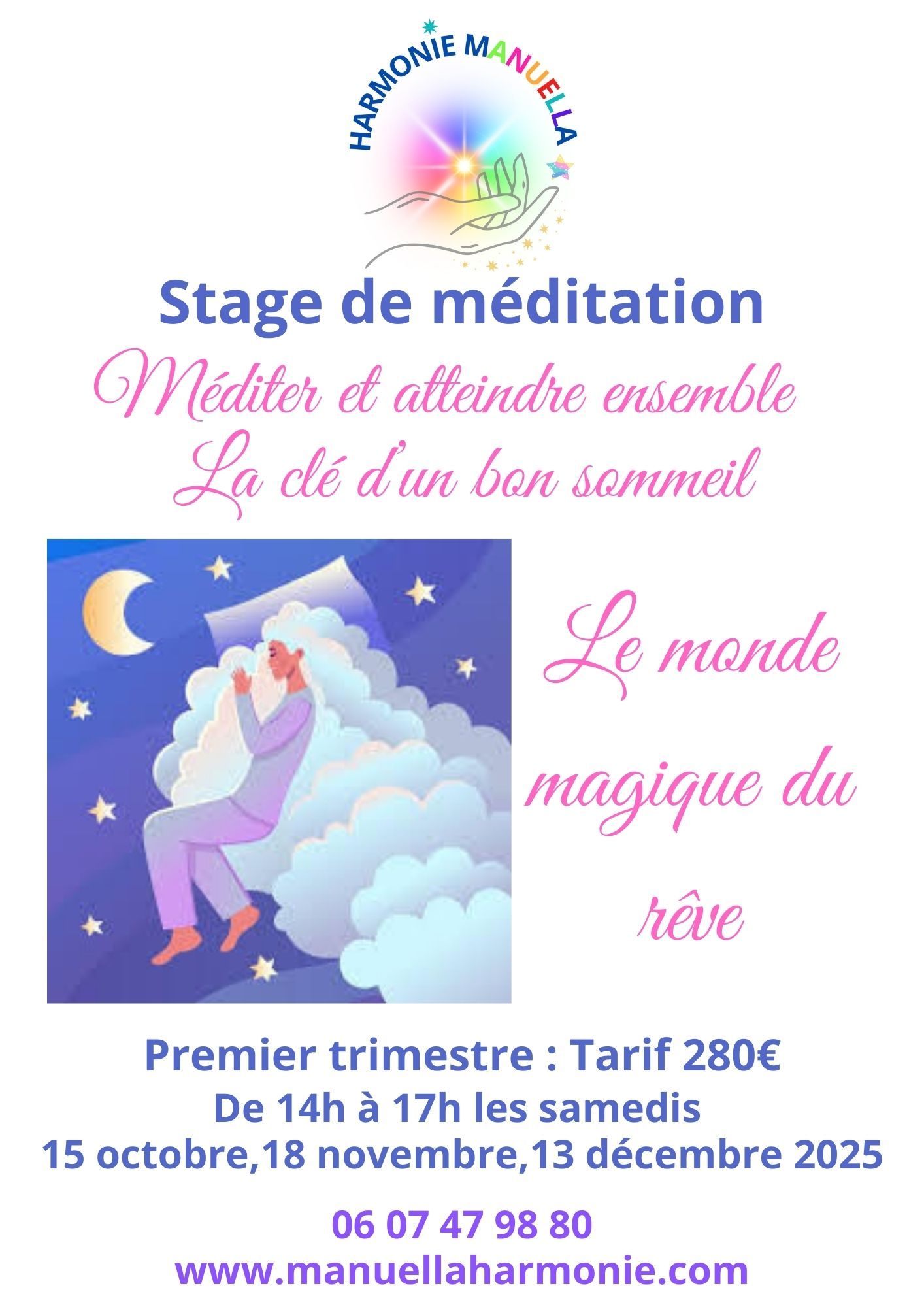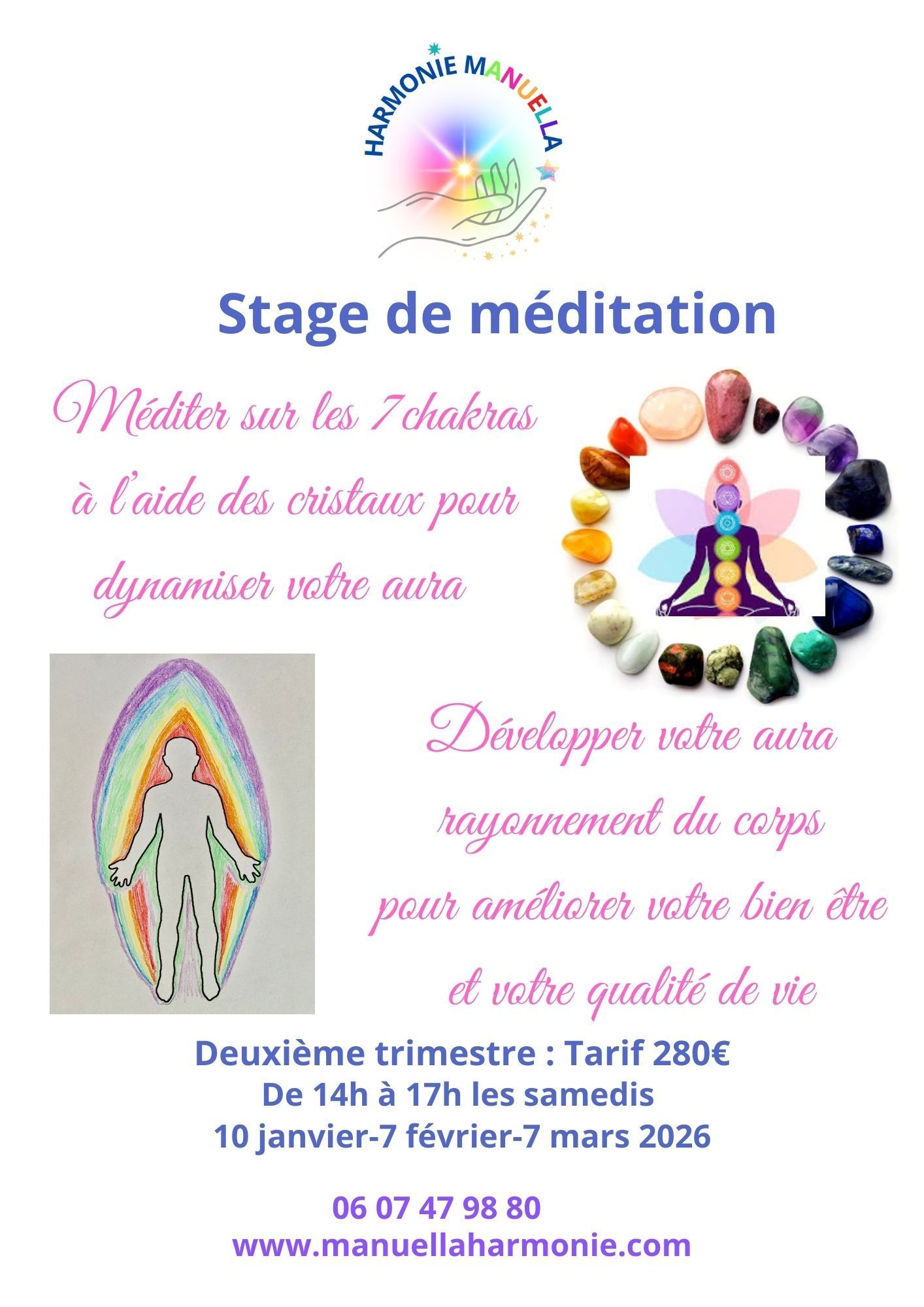 Bonjour, vous êtes partant pour l'aventure ! Choisissez votre stage de trimestre, un thème différent suivi d'une méditation. Des stages de méditation peuvent être programmés à d'autres dates sur demande à Manuella.